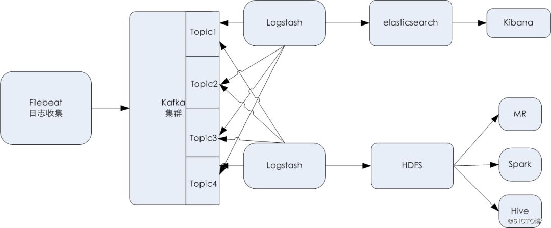 此架构的优点在于引入了消息队列机制,均衡了网络传输,从而降低了网络闭塞尤其是丢失数据的可能性,但依然存在Logstash占用系统资源过多的问题,在海量数据应用场景下,可能会出现性能瓶颈。