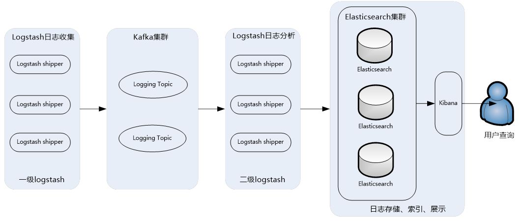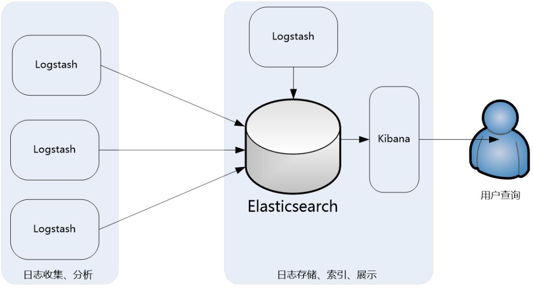 此架构主要是将Logstash部署在各个节点上搜集相关日志、数据,并经过分析、过滤后发送给远端服务器上的Elasticsearch进行存储。Elasticsearch再将数据以分片的形式压缩存储,并提供多种API供用户查询、操作。用户可以通过Kibana Web直观的对日志进行查询,并根据需求生成数据报表。