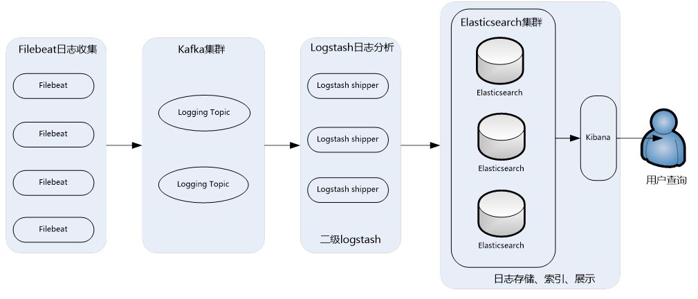 此架构主要特点是引入了消息队列机制,位于各个节点上的Logstash Agent(一级Logstash,主要用来传输数据)先将数据传递给消息队列(常见的有Kafka、Redis等),接着,Logstash server(二级Logstash,主要用来拉取消息队列数据,过滤并分析数据)将格式化的数据传递给Elasticsearch进行存储。最后,由Kibana将日志和数据呈现给用户。由于引入了Kafka(或者Redis)缓存机制,即使远端Logstash server因故障停止运行,数据也不会丢失,因为数据已经被存储下来了。