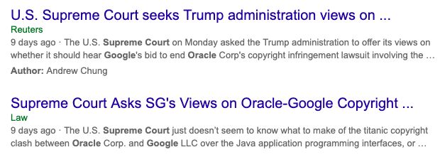谷歌和甲骨文之间旷日持久的 Java API 侵权案件,从 2010 年开始,至今还没有定论。在 2019 年 1 月,Google 要求美国最高法院终止与甲骨文之间 Java 侵权案。