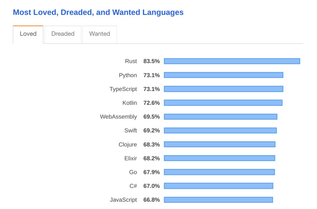 从今年 Stack Overflow 年度开发者调查的数据中也能看到这一点,Kotlin 在最受欢迎的编程语言排第 4 位。如下图所示,报告中指出,在开发者最喜爱的编程语言中,Kotlin 得到了 72.6% 正面反馈。