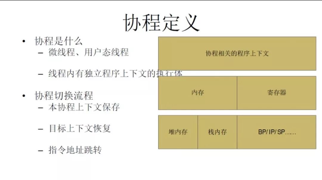协程到底是什么?可以说它是微线程,也可以说它是用户态线程。协程切换流程其实不复杂,它主要任务是把上下文保存起来。上下文只有两个部分,第一部分是内存和寄存器,第二部分是栈的状态。