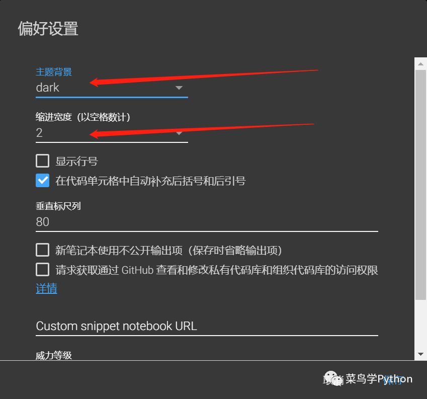 一是"工具"中的偏好设置(下图),在这里可以设置主题背景(共分light和dark两种)、缩进宽度等风格,有趣的是colab还自带coding特效,如果威力等级一栏选择了“many power”,那么在写代码的过程中就会产生非常炫酷的效果。