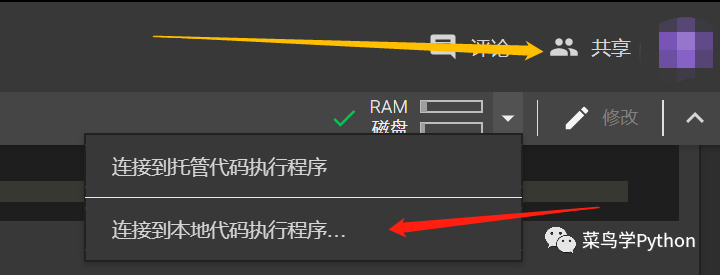 除此之外,colab还允许通过共享的方式邀请他人共同讨论、完善代码;如果你不想将代码放到云端服务器中运行,还可以连接本地的开发环境运行程序(下图)。