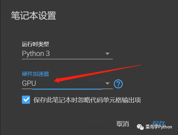 二是“修改”中的笔记本设置,这里可以设置运行时的python版本和硬件加速器。说到这里不得不佩服谷歌,居然提供了GPU和CPU两种加速模式,只要在选项中进行设置,就可以免费获取额外的算力,这下通过在线编辑器使用TensorFlow再也不是梦想了。