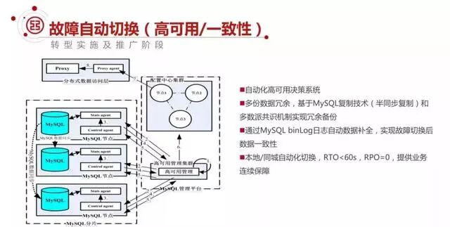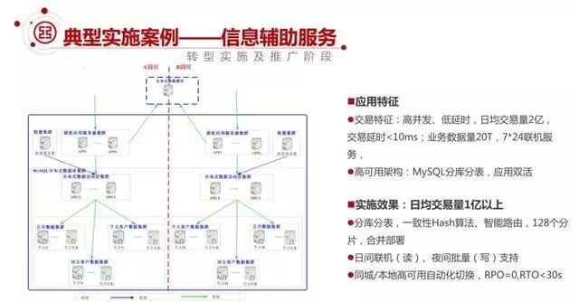我们实施的架构是高可用架构同城分片双活。实施效果是日均交易量超1亿以上,本地高可用做到自动化切换,RPO=0,RTO<30S。同城高可用切换也是60秒内切换。