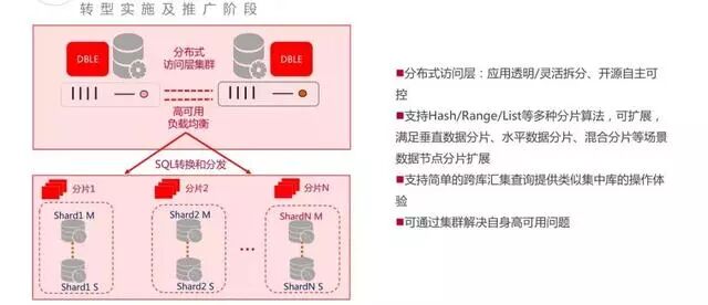 通过引入这样一个DBLE来支持垂直数据分片、水平数据分片、混合分片等场景的支持,还支持简单的跨库汇集查询提供类似集中库的操作体验,这个时候开发场景就简化了,给了应用更多的选择,简化了应用开发的复杂度。
