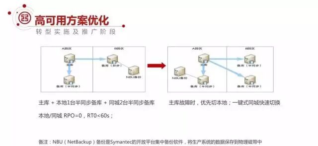 在这个过程中,我们又对高可用方案进行了持续的优化,同时学习和借鉴互联网包括分布式数据库的一些方案,我们把一主两备,本地1备和同城1备,扩展成1主3备,通过半同步的机制,做到真正的在系统级去保证RPO=0;