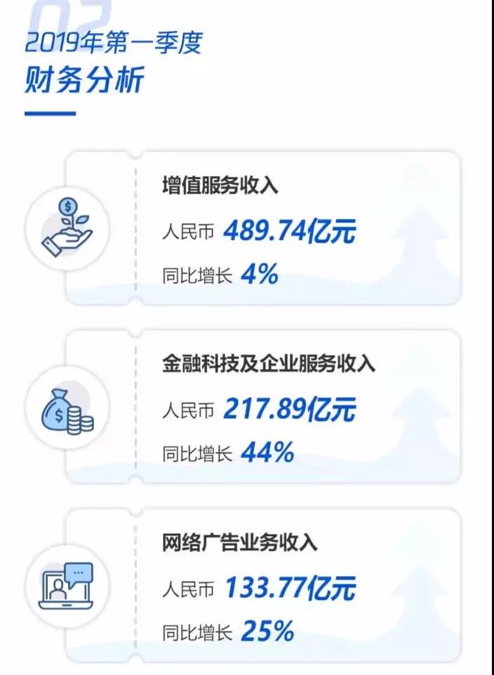 一季度财务解析,金融科技板块增速最猛。增值服务收入 489.74 亿元,同比增长 4%。网络游戏收入为 285.13 亿元,同比微跌 1%;社交网络收入为 204.61 亿元,增长 13%。