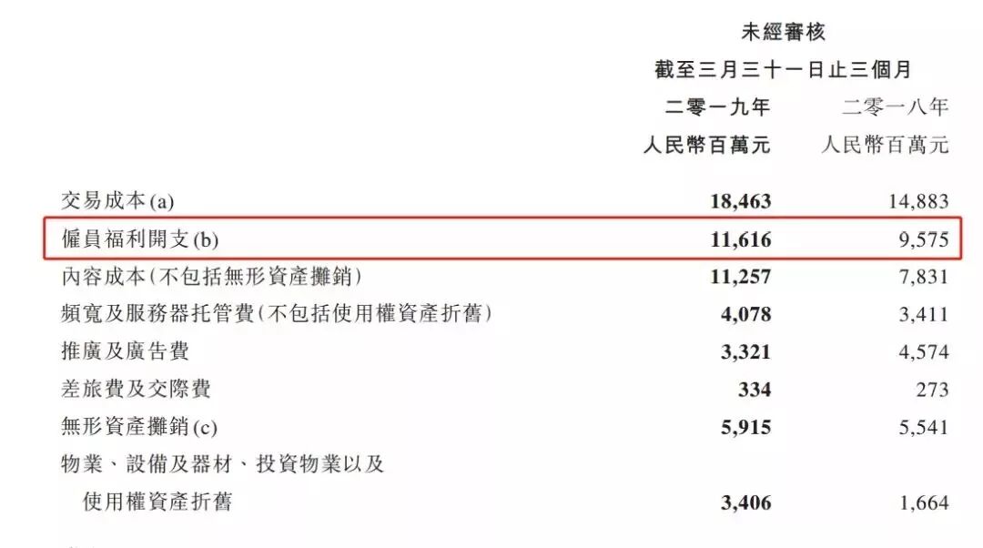于 2019 年 3 月 31 日,腾讯有 5.46 万名雇员。而截至 2019 年 3 月 31 日止三个月,腾讯的总酬金成本为人民币 116.16 亿元。以雇员数和总酬金计算,2019年第一季度,腾讯员工平均月薪 7.09 万元。相比 2018 年第一季度,腾讯员工 2019 年第一季度平均月薪同比增长 2.16%。