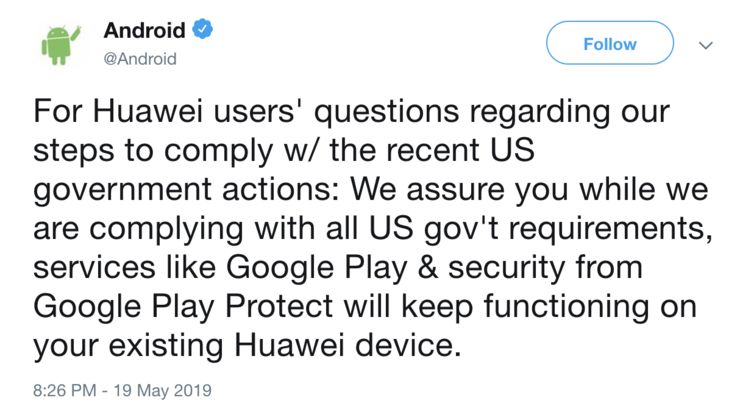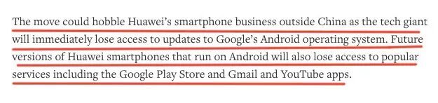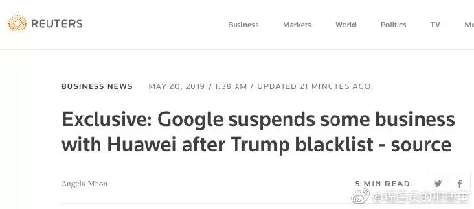 2019 年 5 月 20 日,路透社援引匿名信源报道称,除了通过开放代码源许可公开获取的服务,Google 暂时停止了与华为一切业务往来,包括软硬件转让和相关技术的提供。