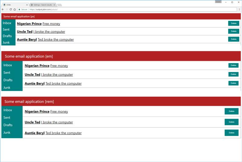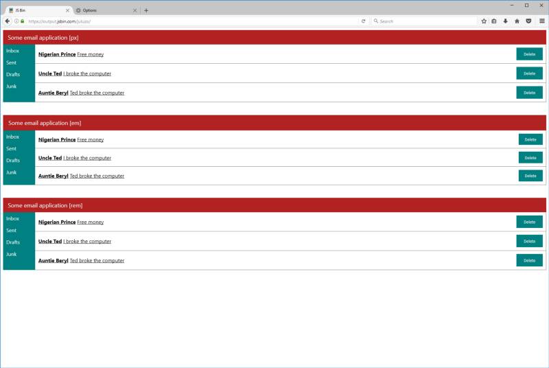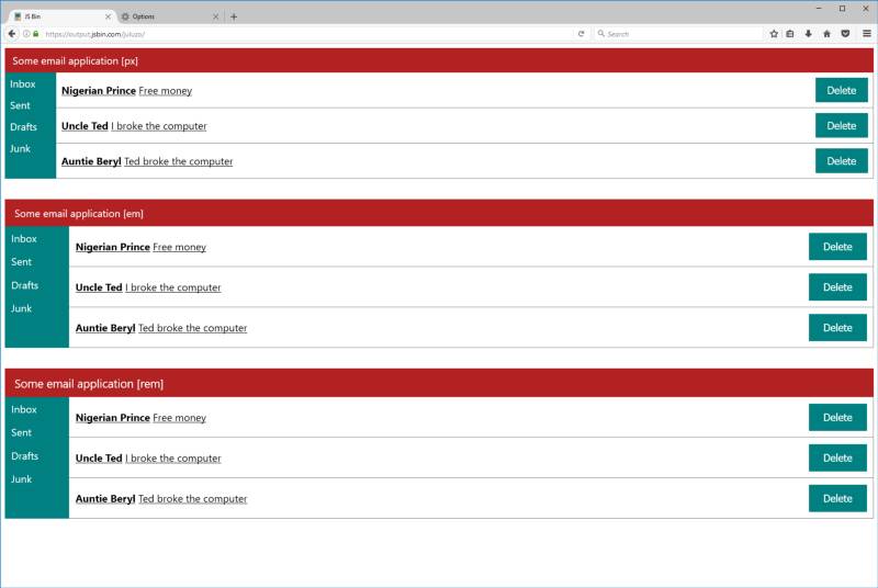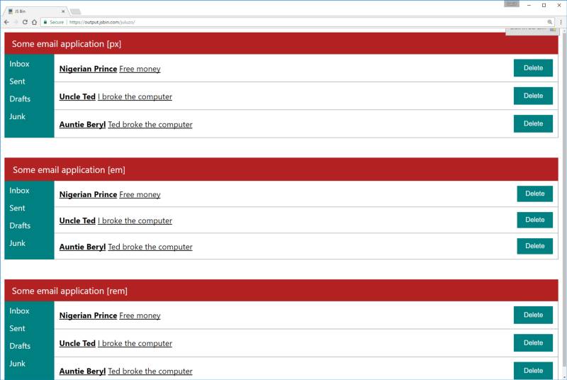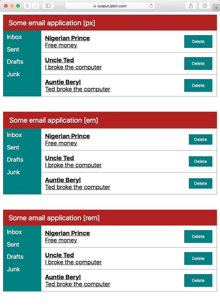 页面上三段的html和css是一样的,唯一不同的是它们所用的单位,最上面那个用的全是px,中间的全是em,最下面的全是 rem。