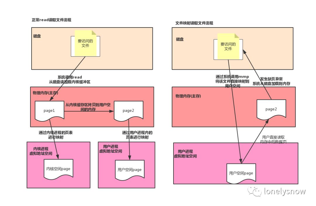 在 Java 中,我们使用 MappedByteBuffer 来实现内存映射,这是一个堆外内存,在映射完之后,并没有立即占有物理内存,而是访问数据页的时候,先查页表,发现还没加载,发起缺页异常,然后在从磁盘将数据加载进内存,所以一些对实时性要求很高的中间件,例如rocketmq,消息存储在一个大小为1G的文件中,为了加快读写速度,会将这个文件映射到内存后,在每个页写一比特数据,这样就可以把整个1G文件都加载进内存,在实际读写的时候就不会发生缺页了,这个在rocketmq内部叫做文件预热。