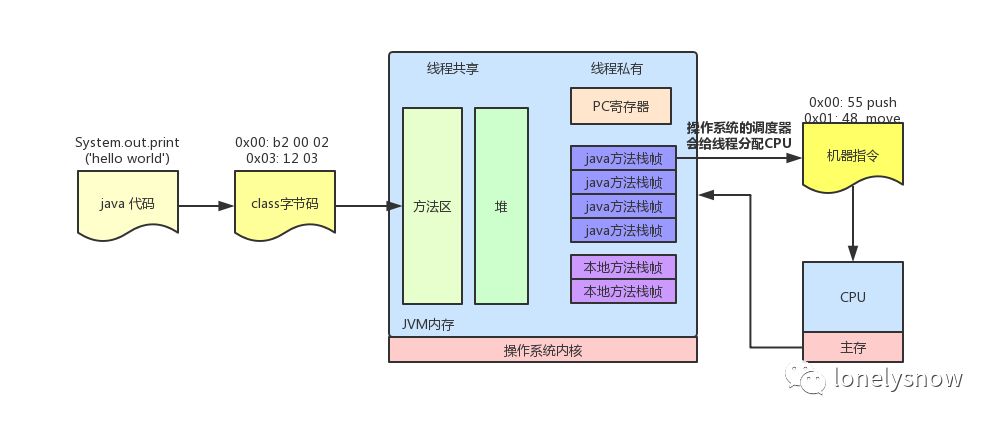 一行代码能够执行,必须要有可以执行的上下文环境,包括,指令寄存器,数据寄存器,栈空间等内存资源,然后这行代码必须作为一个执行流能够被操作系统的任务调度器识别,并给他分配 CPU 资源,当然这行代码所代表的指令必须是 CPU 可以解码识别的,所以一行 Java 代码必须被解释成对应的 CPU 指令才能执行。下面我们看下System.out.println("Hello world")这行代码的转译过程。