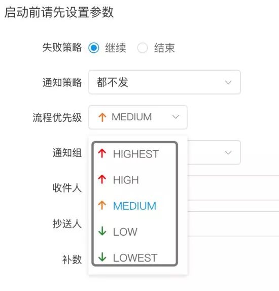 其中流程定义的优先级是考虑到有些流程需要先于其他流程进行处理,这个可以在流程启动或者定时启动时配置,共有5级,依次为HIGHEST、HIGH、MEDIUM、LOW、LOWEST。