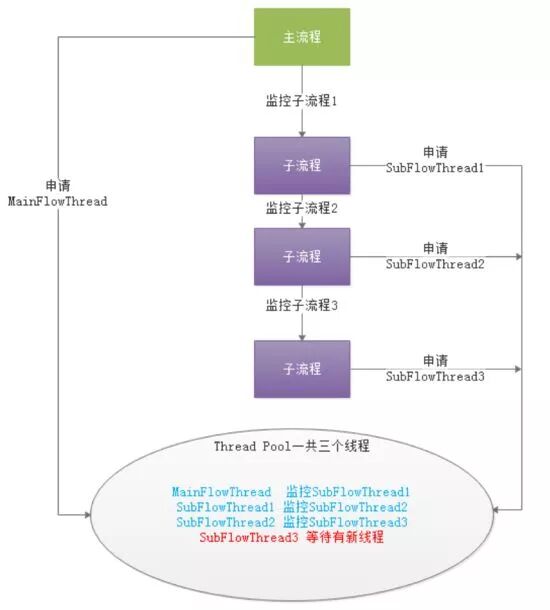 上图中MainFlowThread等待SubFlowThread1结束,SubFlowThread1等待SubFlowThread2结束, SubFlowThread2等待SubFlowThread3结束,而SubFlowThread3等待线程池有新线程,则整个DAG流程不能结束,从而其中的线程也不能释放。这样就形成的子父流程循环等待的状态。此时除非启动新的Master来增加线程来打破这样的”僵局”,否则调度集群将不能再使用。