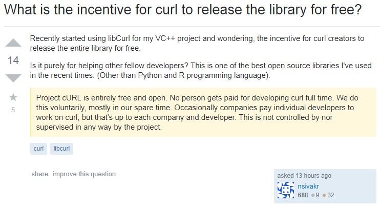 近日在浏览 StackOverflow 的时候,有开发者发表了一个这样的问题 —— “What is the incentive for curl to release the library for free?”。