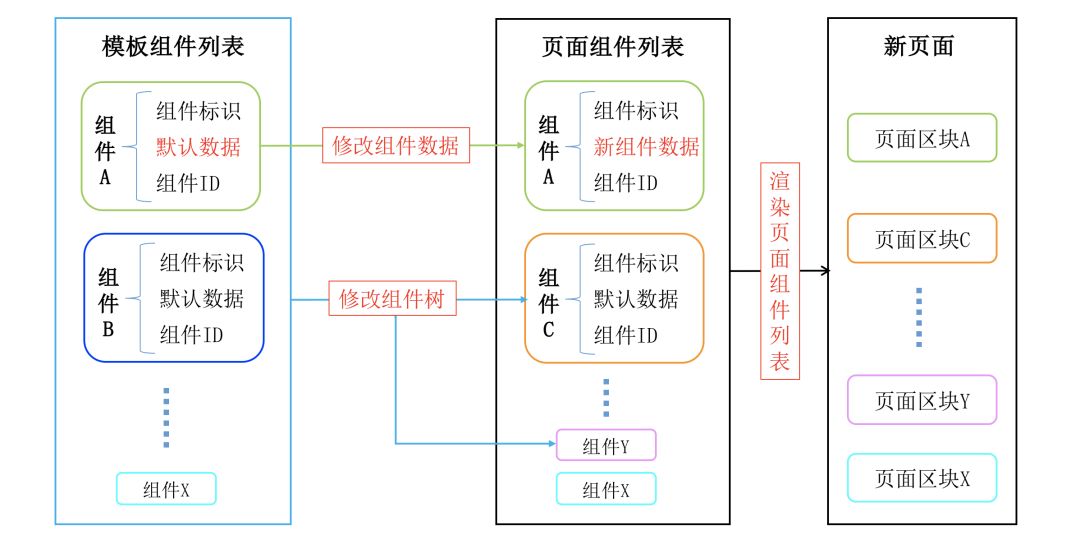 模板带有页面的默认数据; 对于组件化的页面, 模板是从组件库中选取部分组件, 并带有各个组件的默认配置数据.