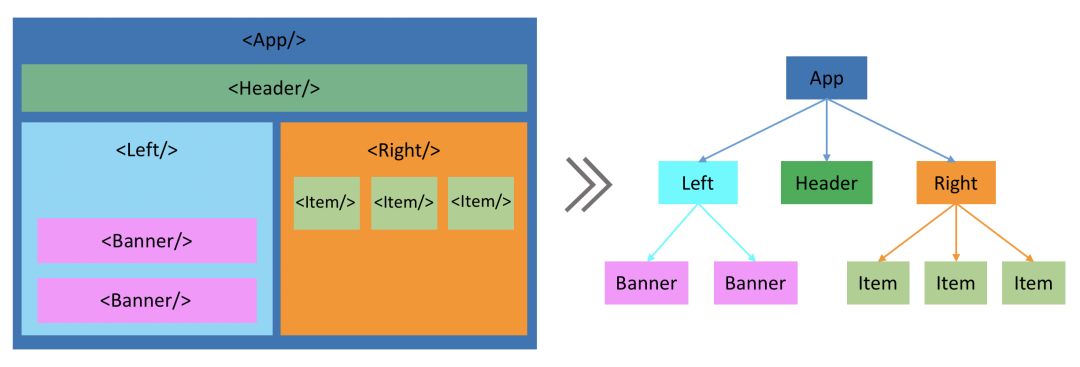 使用组件化的方式来组织页面, 页面可以认为是一棵组件树, 如下图所示, 树中的节点为页面组件, 页面组件可以包含子组件.