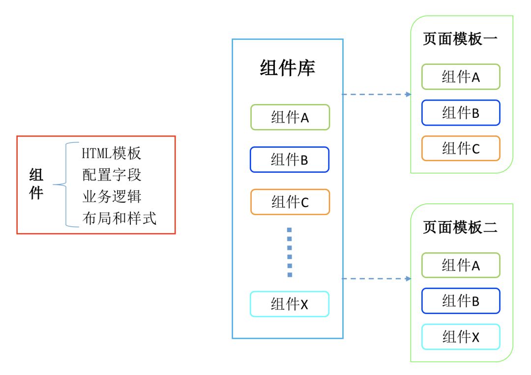 如上图所示, 页面组件库中有组件A, 组件B, 组件C, 组件D, …, 组件X等. 页面模板一由组件库中的组件A, 组件B和组件C组成, 实现了一个完整的业务功能; 页面模板二由组件库中的组件A, 组件B和组件X组成, 完成另一个完整的业务功能.
