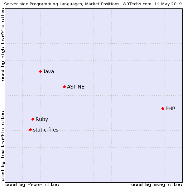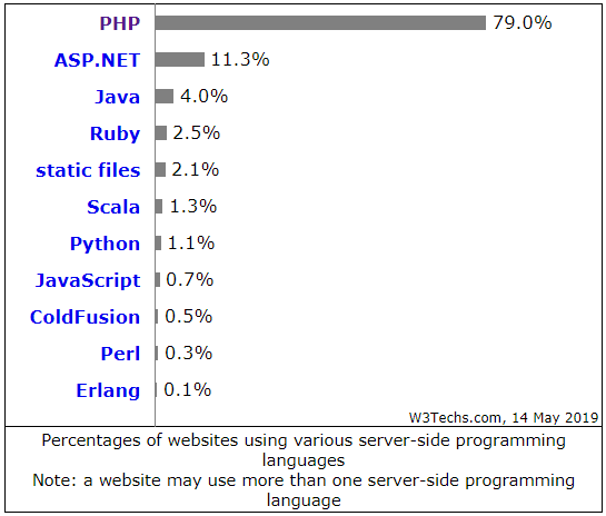 我们看到上面的图显示了 W3Techs 所统计的网站服务器端使用的编程语言情况(值得一提的是:很多网站的服务器端可能不止使用一门编程语言)。