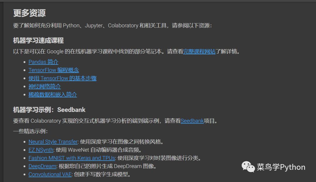 然而,colab给自己的定位却是旨在帮助传播机器学习培训和研究成果,所以Colab还关联了一个非常优秀的机器学习学习平台。
