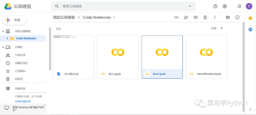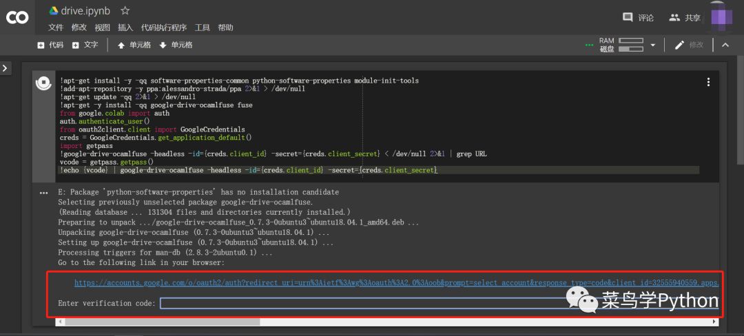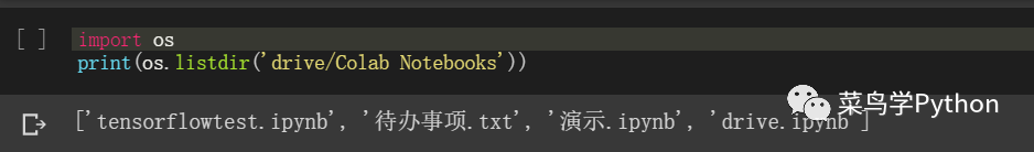 如果在colab中保存过notebook文件,系统将会自动关联你的colab和云端硬盘账户,否则需要在云端硬盘中进行手动关联(此处略)。然后在代码框中输入以下代码并运行。