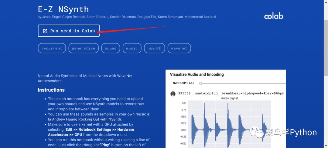 除了教学网站,colab还有大量交互式机器学习分析的端到端示例(seedbank)供学习和练习,所有seedbank中的项目都可以一键导入colab中运行(下图)。