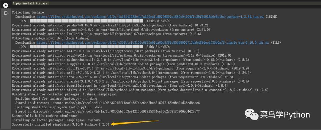 既然可以使用pip指令,那如果想安装其他Python库的时候也可以很方便地安装了,我拿tushare做了一个试验,结果如下: