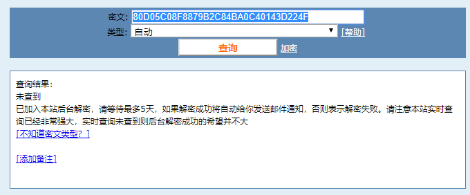 加盐密文:80D05C08F8879B2C84BA0C40143D224F