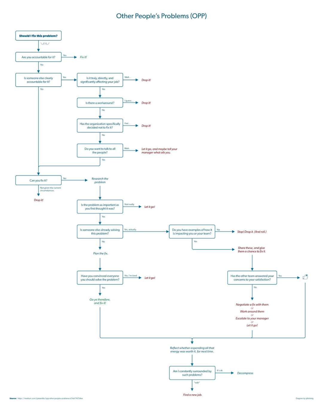 我意识到只有少数问题是值得我解决的。去解决所有的问题,这只是你的美好愿望。我在卡米尔·弗尔涅(Camille Fournier)的文章中发现了这个流程图,它提供了一个很好的框架来帮助你选择要参加哪一场战斗。